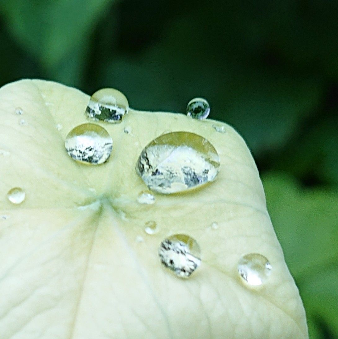 雨粒に周りの木々が映っています